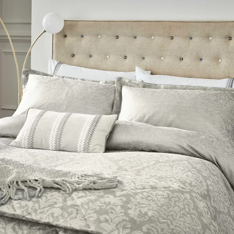 Lavana Kingsize Duvet Cover SET Linen Lavana offers the perfect balance between classic and contemporary, featuring an intricate repeating damask pattern captured in linen tones. The duvet cover and Oxford pillowcases feature a piped edging and the coordinating standard pillowcases are embellished with tonal zigzag embroidery. Layer up with the quilted and fringed throws and complete the bed with the eye-catching embroidered cotton cushion Includes Pair of Pillowcases