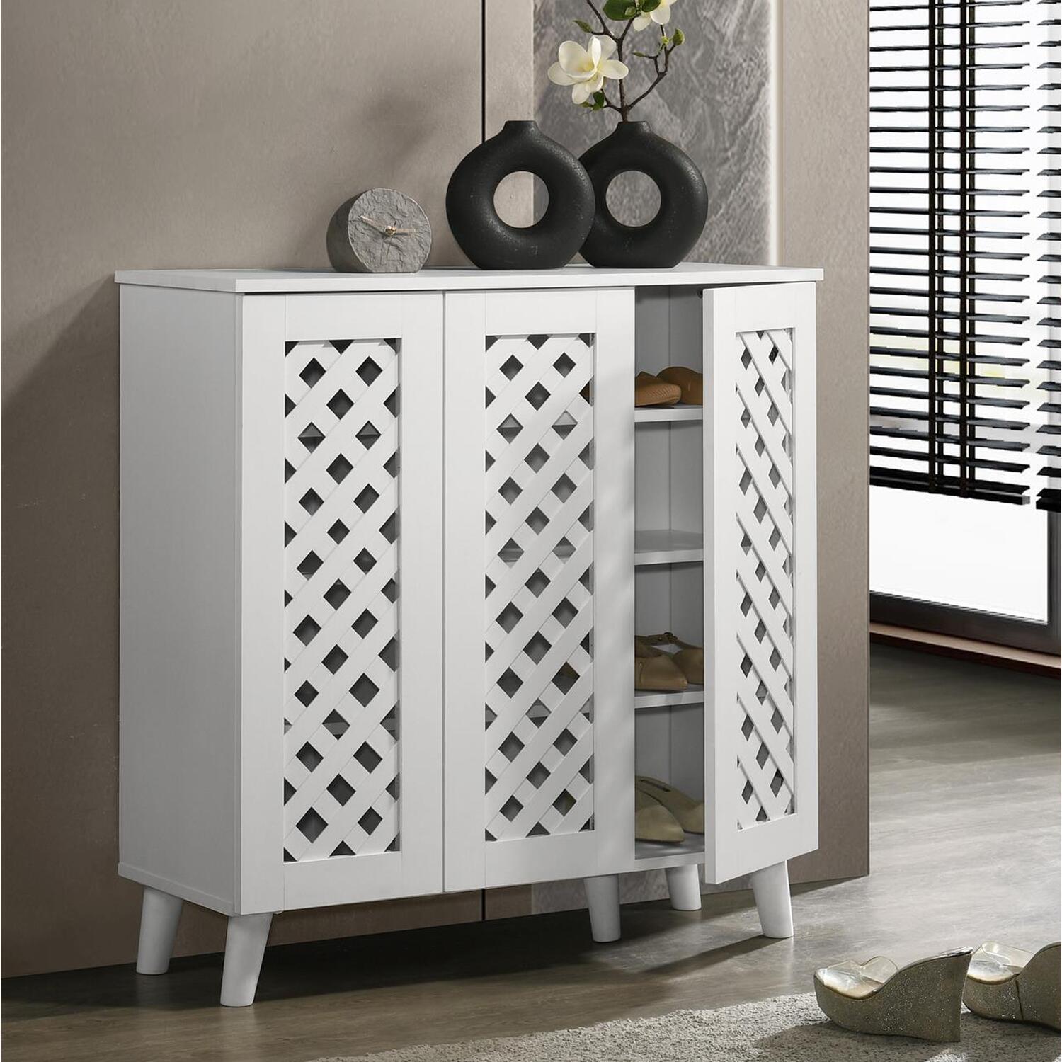 Elevate your hallway or bedroom with our 3 Door Shoe Cabinet, available in White finish. This contemporary piece combines style and functionality, offering ample storage space with multiple interior shelves to keep your footwear neatly organised. The sleek design, featuring intricate lattice door panels, adds a touch of sophistication to any decor. Crafted with attention to detail, this versatile cabinet maximises space while enhancing the aesthetic appeal of your home. Dimensions 80cm W x 30cm D x 90cm H Spacious Storage This 3-door cabinet features multiple interior shelves, offering ample space to organise and store up to 18 pairs of shoes. Elegant Design Available in two sophisticated finishes, Sonoma Oak or White, this contemporary cabinet boasts a sleek, latticed door pattern that enhances any hallway or bedroom decor. Durable Construction Crafted with high-quality materials, this sturdy cabinet ensures long-lasting use and stability. Versatile Functionality. In addition to shoe storage, the cabinet's shelves can accommodate various household items, maximising space utilisation. Easy Assembly Straightforward instructions allow for hassle-free assembly, ensuring a seamless addition to your home.