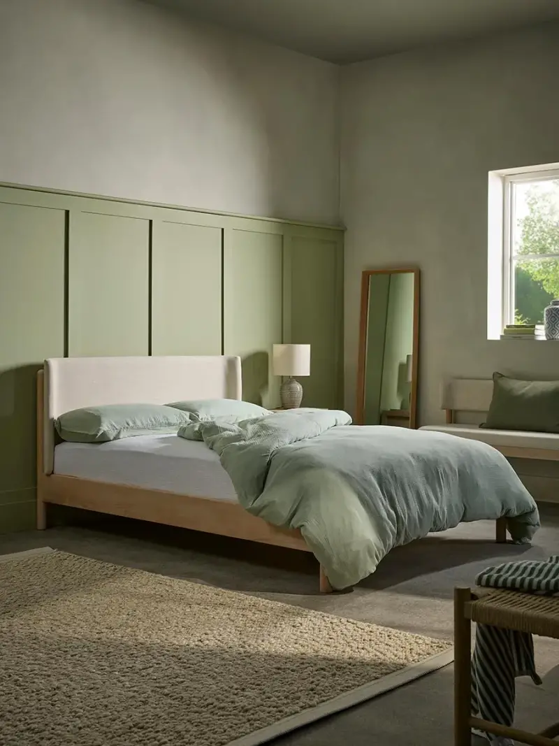 Our Aalborg bed boasts an elegant, upholstered headboard, gracefully curving around the frame's top. It comes in two sizes: double and king, catering to various preferences and spaces. The bed's low-profile frame is accentuated by subtle, rounded feet, creating a sleek and modern silhouette. This design seamlessly blends into contemporary and Scandi-inspired interiors, offering a versatile and stylish option. Additionally, a slatted base provides comfortable and supportive foundations for your chosen mattress, ensuring a good night's rest.