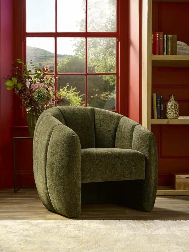 A statement armchair to support our Aars Sofa, this fluted style offers a tub chair profile with a cocooning back that brings a boutique hotel style aesthetic to a room.Upholstered in a softly textural moss green fabric that will complement most schemes, we love pairing it with the jewel bright accessories found in our Hotel Luxe trend.