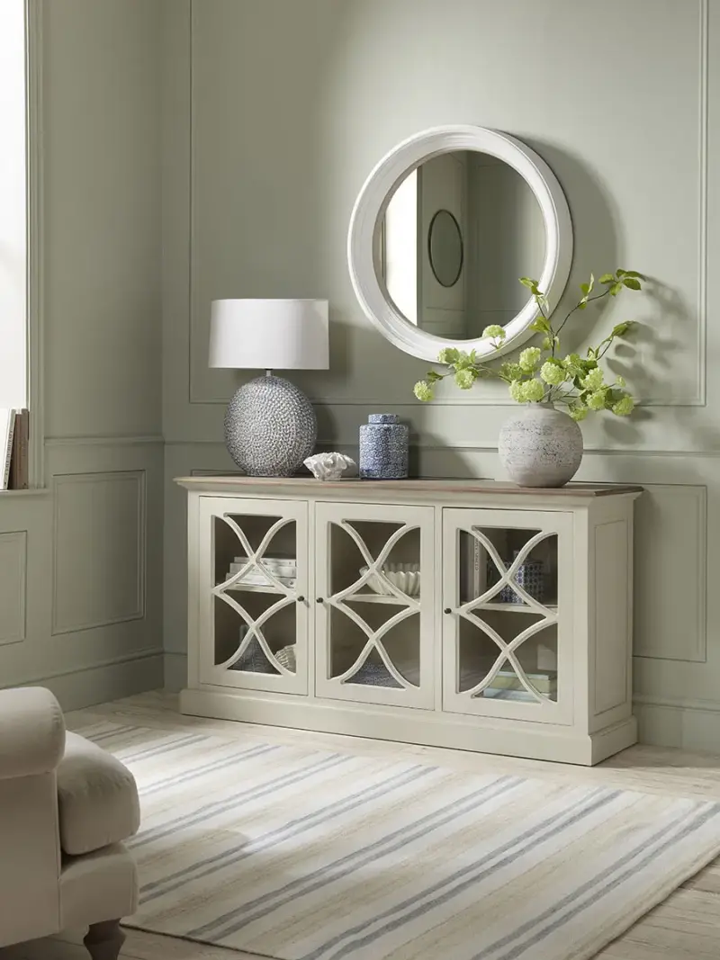 Our Ainhoa Sideboard is the perfect combination of elegance and style, perfectly suiting a place in either your living or dining space.A wood toned table top contrasts the light painted frame with doors that have glass panels and a shelf within, ideal for displaying some of your finest accessories and keeping clutter at bay.Finished with small, round black handles, its simple country charm will elevate in any setting.