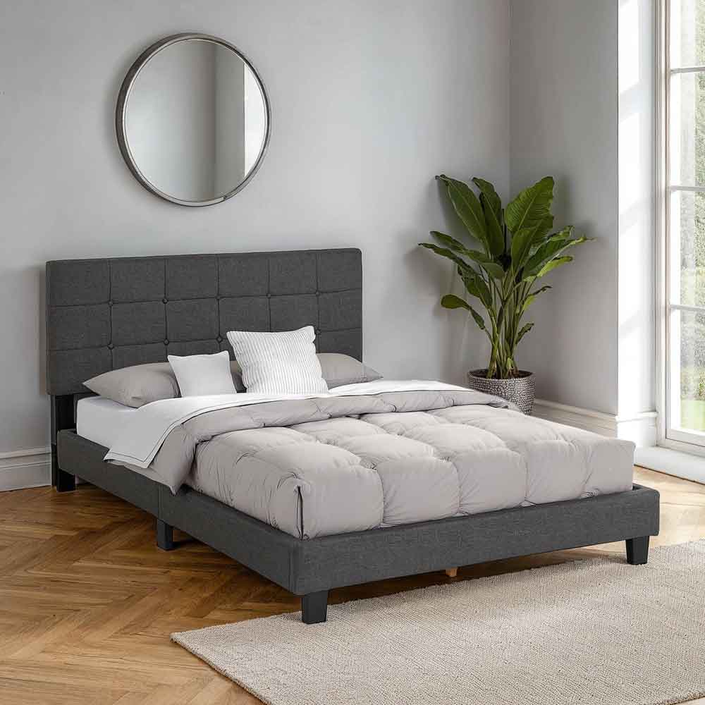 Enhance your bedroom with modern elegance and everyday comfort using the Furniture in Fashion Akron Fabric Double Bed in Grey. Upholstered in a soft grey fabric, this stylish bed frame offers a contemporary look that blends effortlessly with a wide range of interior styles, from minimalist to cosy modern decor. Its clean silhouette and neutral tone make it an ideal centrepiece for both master bedrooms and guest rooms. Designed with practicality and durability in mind, this double bed combines a sturdy frame with supportive construction to ensure long-lasting performance. The padded headboard provides added comfort for relaxing in bed, while the strong slatted base delivers reliable mattress support for a restful sleeping experience. Perfect for modern living, this bed balances comfort, style, and functionality in one elegant design. FEATURES: Material: Fabric Finish: Grey Mattress not included Soft fabric finish adds a sophisticated and contemporary touch to any bedroom decor Provides supportive backing ideal for reading or relaxing in bed Made using fabric, foam, plywood, metal, and laminated slats for long-lasting stability Designed to support up to 200kg for dependable everyday use Creates an open and spacious visual feel within the bedroom Plastic feet enhance stability while helping protect flooring surfaces Neutral grey finish complements modern, classic, and minimalist interiors Available at an affordable price Images shown are for illustrative purposes only DIMENSIONS: Height: 97cm Width: 146cm Depth: 204cm