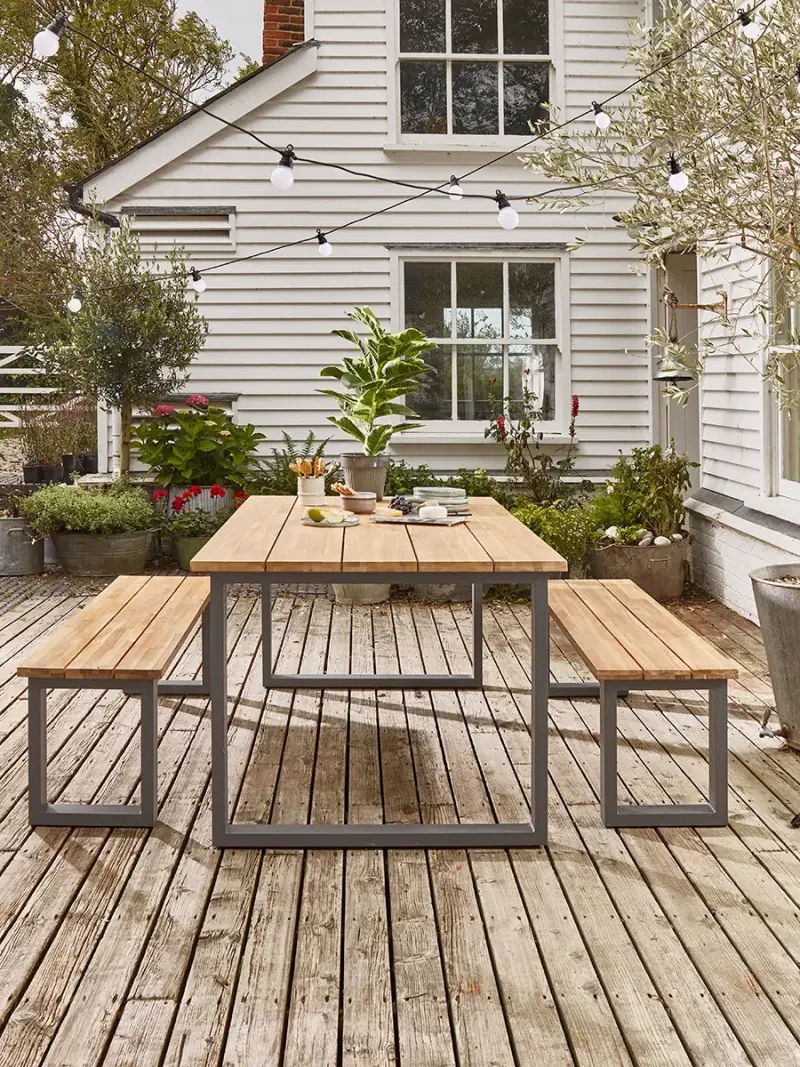 The top of our Albany Dining Set is crafted from treated acacia wood, a sturdy and beautifully toned wood. Perfectly contrasting for statement effect is an industrial look grey steel toned frame.Our set of a table and two benches is a versatile dining solution, providing ample seating with the unlimited aspect of bench seating and a generous table top, and will bring a contemporary punch to your outdoor dining space.Click here to view our useful Outdoor Furniture Buying Guide.Click here for our outdoor furniture care guide.