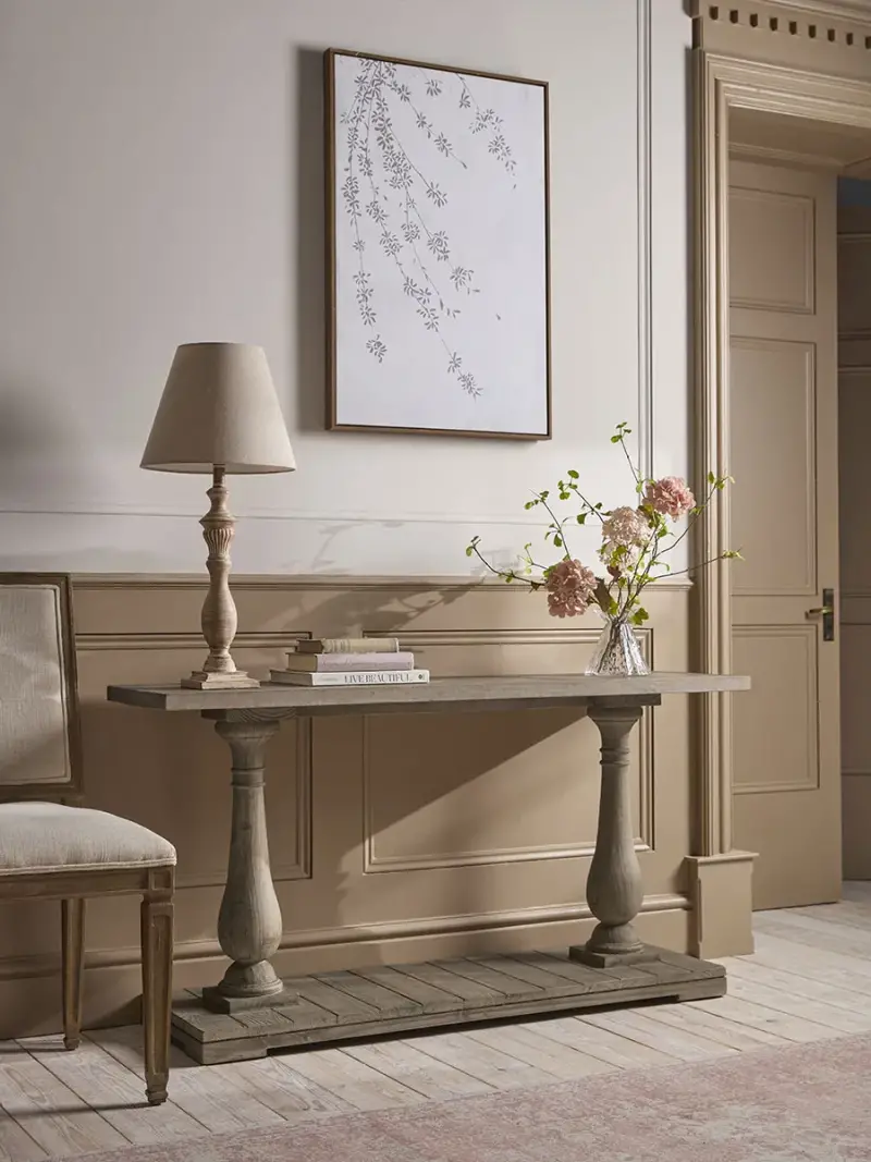 With a delicate parquet style tabletop, our Adina console table is a wonderful addition to any home that is inspired by elegance and individuality.Traditional style legs complement the simple silhouette, which sit on a base with farmhouse like slats, working to create a console table that brings a homely and charming atmosphere to your space.