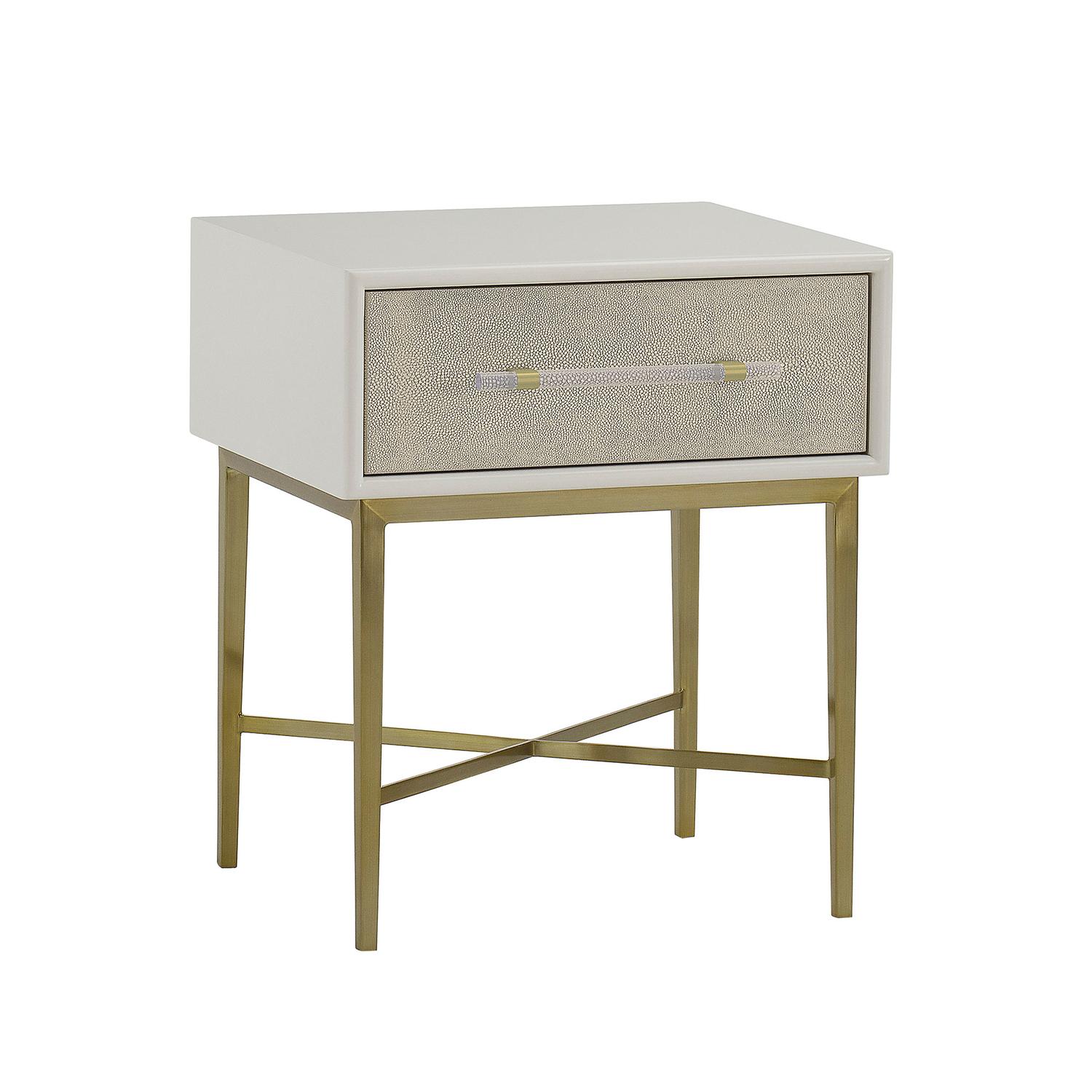 Elegant bedside table with single drawer in faux shagreen This simple bedside table has a classic feel to it, with a single faux shagreen drawer encased in a white frame and perched elegantly on antique brass legs. The clear Perspex handle gives Alice a contemporary edge perfect for chic, elegant interiors. Pairs beautifully with the Alice bed. Alice Bedside Table Ivory, Bedside Table - Andrew Martin