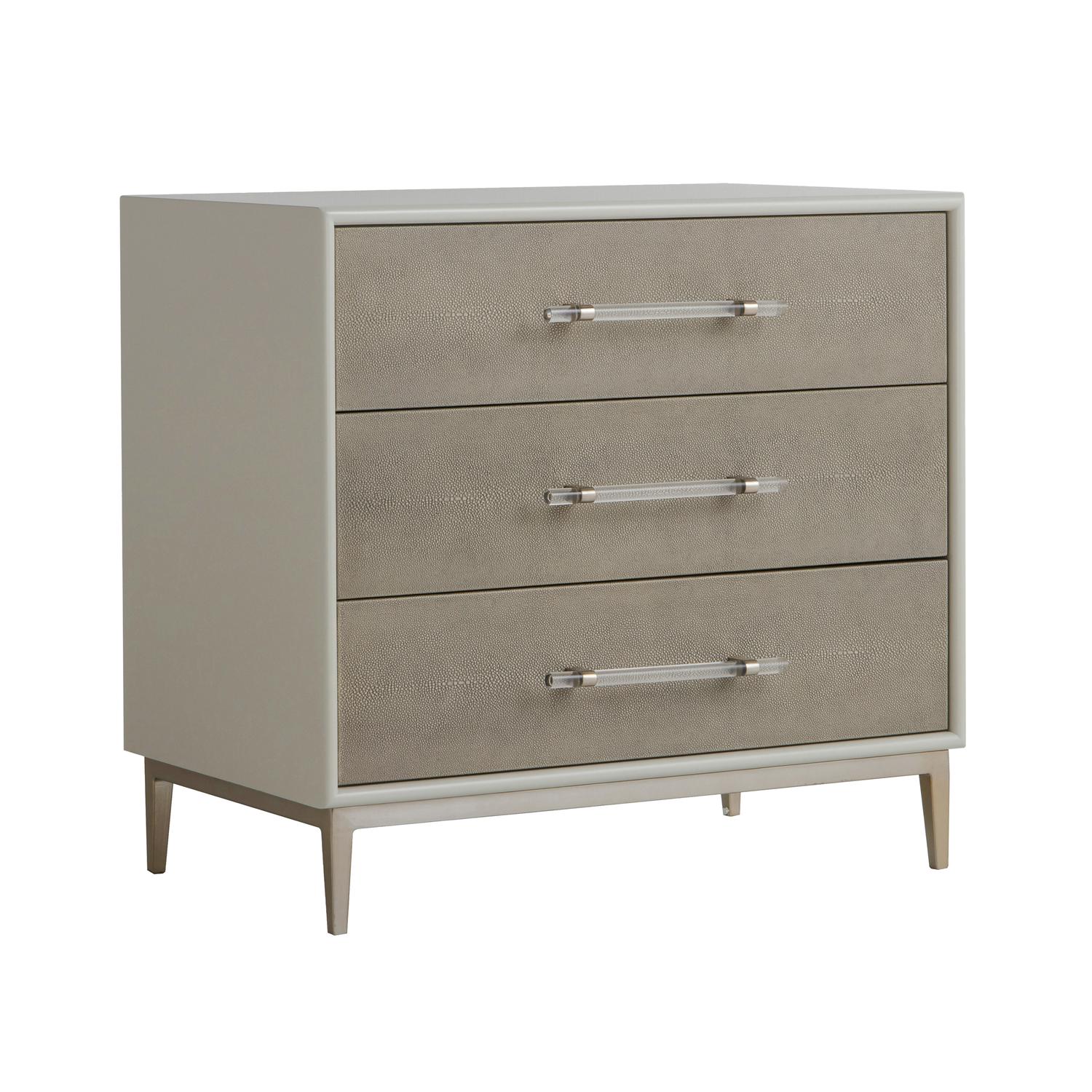 Alice boasts three faux shagreen drawers complimented by solid Perspex handles, encased in a white painted frame and perched elegantly on antique brass finish legs. Alice Nightstand Grey, Bedside Table - Andrew Martin