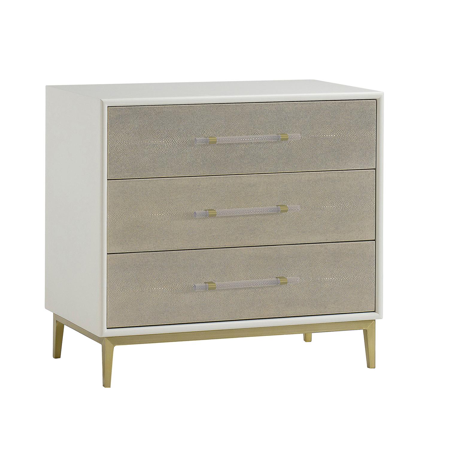 Alice boasts three faux shagreen drawers complimented by solid Perspex handles, encased in a white painted frame and perched elegantly on antique brass finish legs. This sophisticated piece offers ample storage space, whilst the neutral colours and simple silhouette give it a timeless and versatile feel to suit a range of interiors. Alice Nightstand Ivory, Bedside Table - Andrew Martin