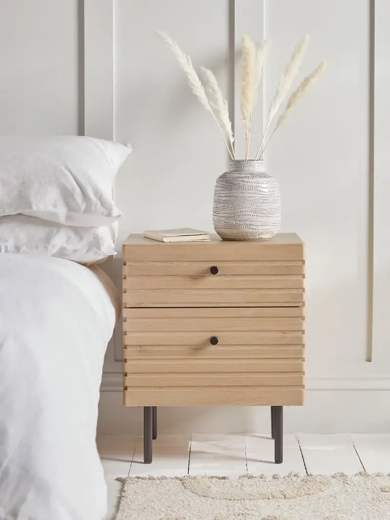 Filled with the texture and warmth of real oak, our Alma Bedside Table is a stylish addition to a neutral scheme where the natural beauty of the wood can shine. A simple boxy shape is enhanced with slatted front panels to the two drawers and the whole piece is set on slim metal legs for a clean finish. An Alma Clothes Rail is also available.