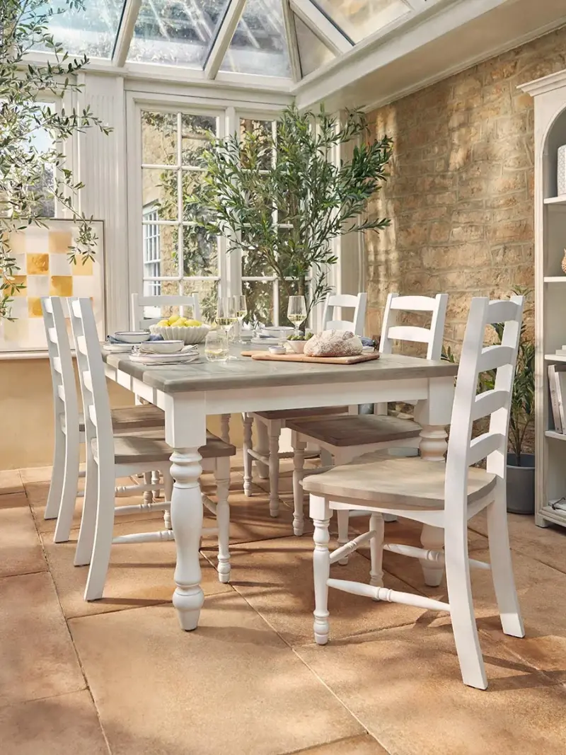 Invite a calming dining experience into your home with our Almelo Dining Table.Simplicity is created with the delicately carved legs in a white painted wood that support a rectangular table top. Its gently distressed finish shows off the beautiful natural patina fo the wood, creating a laid-back and minimalist dining table.Pair with our set of two Almelo Dining Chairs.