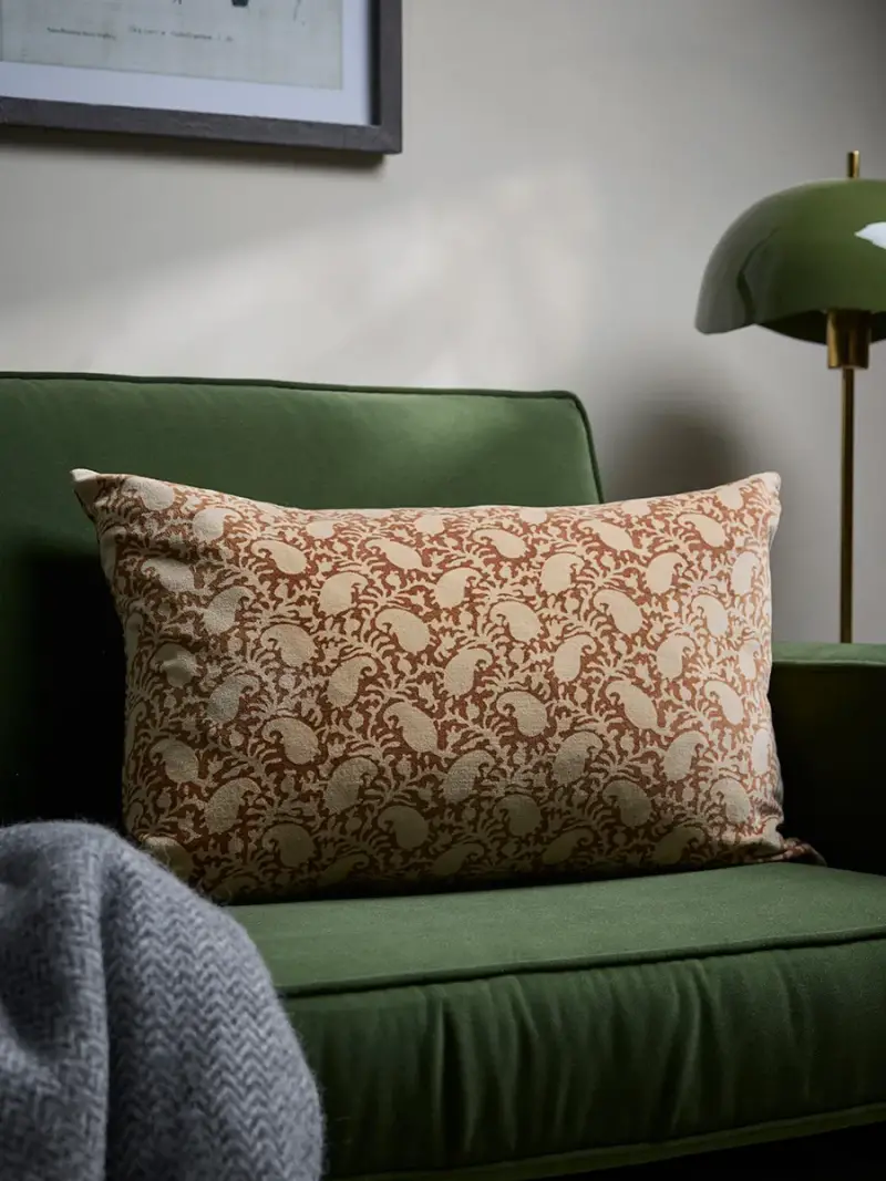This luxurious cushion features a rich burnt orange paisley style print on a warm cream velvet background. This beautiful earth-toned piece makes a wonderful decorative addition to your sofa or armchair this season. The rectangular shape also makes it an ideal cushion for adding to your bed styling.