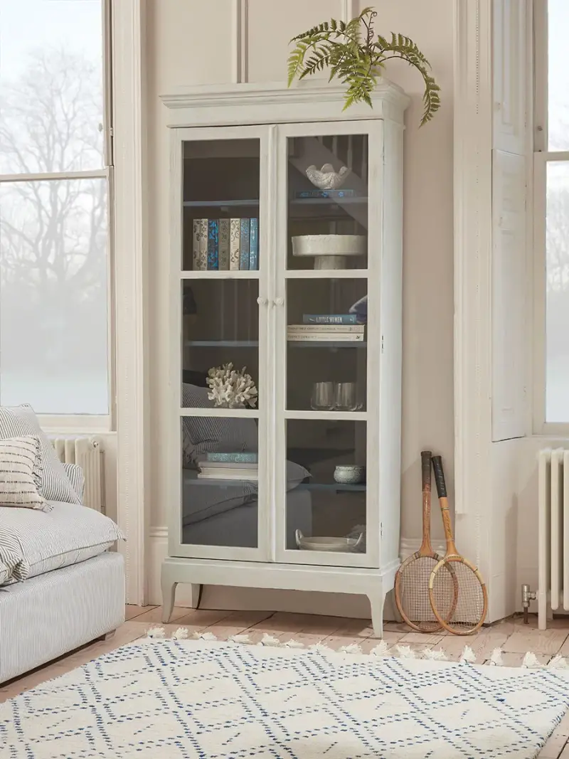 Romantic and serene, our Anara Display cabinet is ideal for creating a gentle country feel in your home.A willowy silhouette is complemented by elegant cabriole legs and a soft whitewashed finish. In contrast, the interior is painted a moody deep blue which will provide a striking backdrop to any collections you choose to display.The cabinet has five shelves and glazed doors, with magnetic closures and attractive floral-themed knobs.