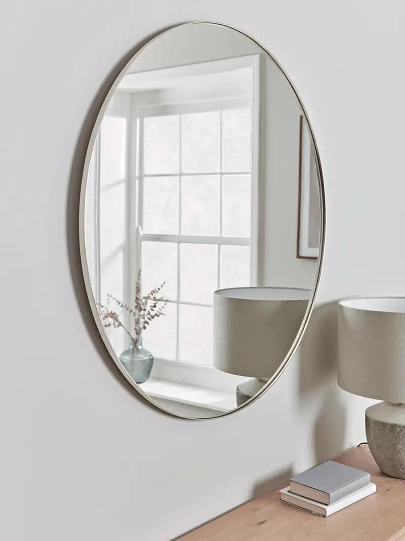 Simple and contemporary, our large, round mirror features the slenderest of metal frames in a minimal, lightly antiqued, matte silver finish. Display above a bench in your hallway, over a console or above your bed to reflect light from all directions and add a modern feature to your wall space.