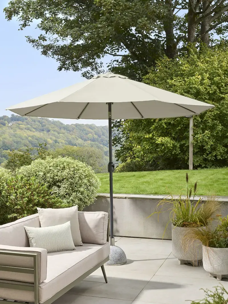 Bring understated elegance to your outdoor setting with this olive green garden parasol, designed to offer welcome shade while enhancing the look of your space. The cream canopy sits beautifully against natural planting and stone, lending a relaxed, Mediterranean feel to terraces and garden tables alike.With a sleek aluminium central pole and matching aluminium ribs, the parasol is lightweight yet reassuringly sturdy.The polyester canopy provides reliable protection from the sun and is water resistant. It can also be removed and hand-washed, helping to keep it looking fresh year after year.The parasol is raised via a handle crank and can be tilted.A refined and functional piece, perfect for long lunches, leisurely afternoons and softly shaded evenings outdoors.Browse our useful Outdoor Furniture Buying Guide.Click here for our outdoor furniture care guide.