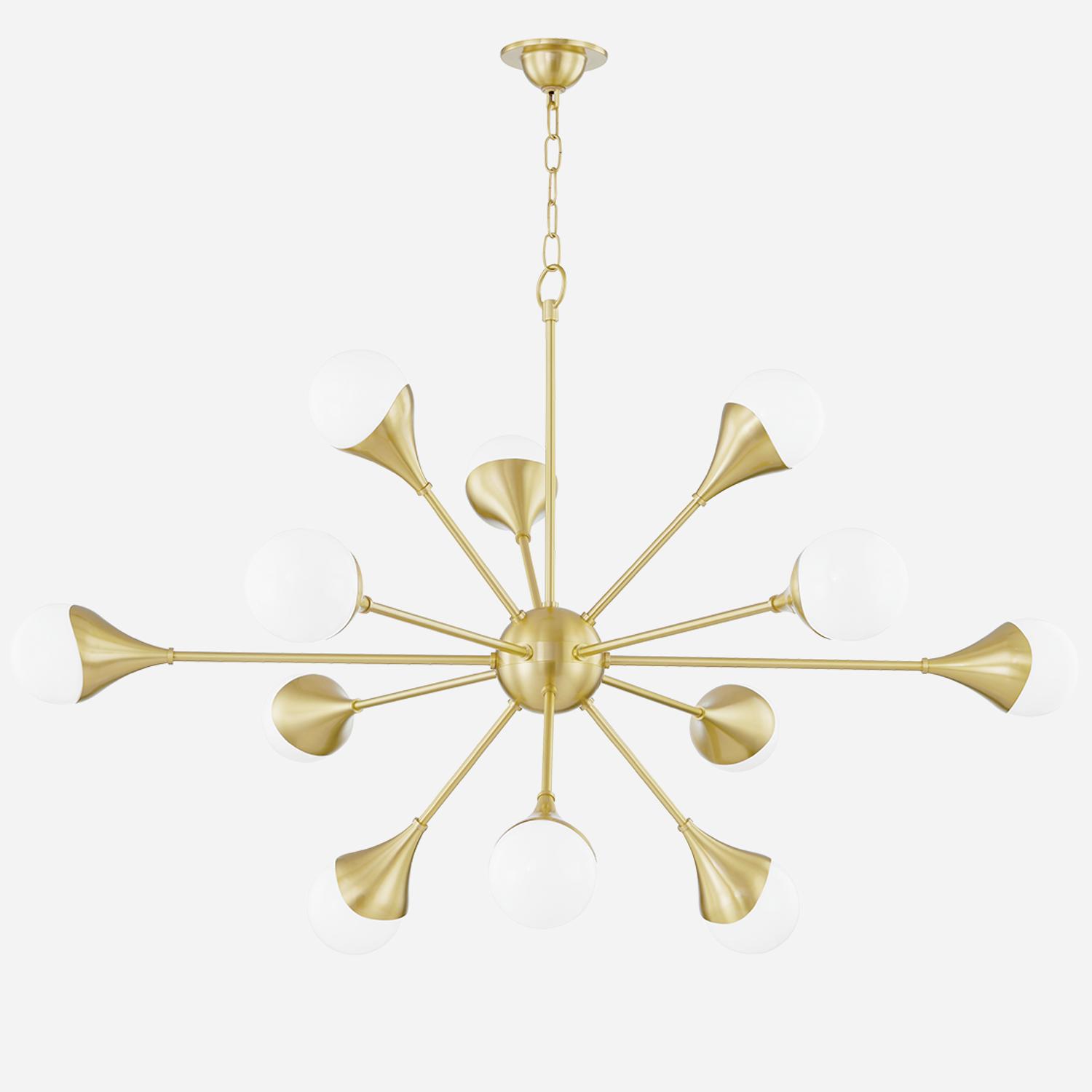 The large Ariana 12-light chandelier features opal-glass shades that drop from smooth, aged-brass holders. Ariana Chandelier, Chandelier, Brass - Andrew Martin