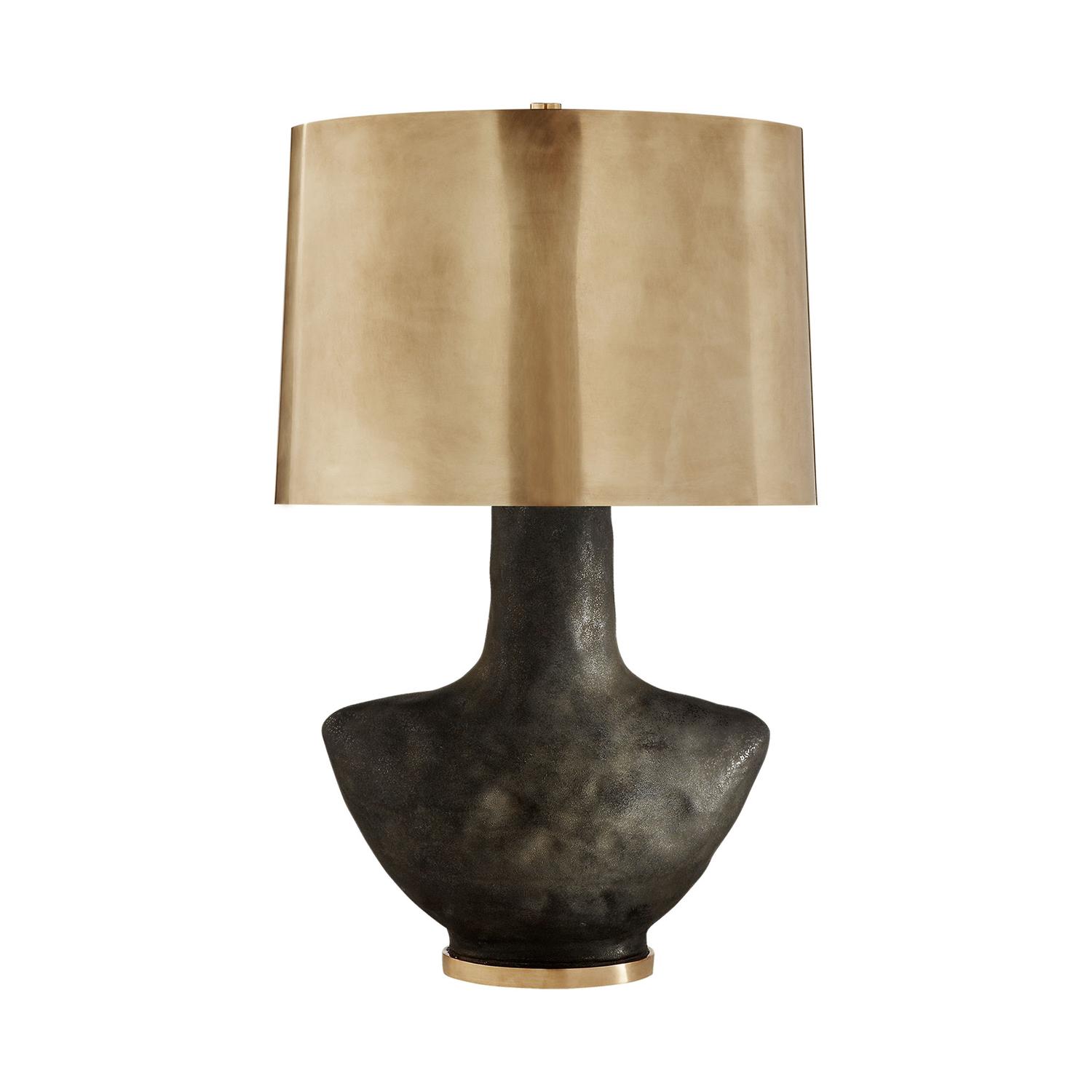 A wonderfully tactile dark ceramic table lamp with antique burnished brass shade, designed by Kelly Wearstler. The base has been coated with a reactive ceramic glaze that when fired gives the material a unique pearlescent sheen. With the organic shapes and metallic accents, this table lamp exudes an air of opulence. Armato Table Lamp Black, Table Lamp, Black/Brass - Andrew Martin