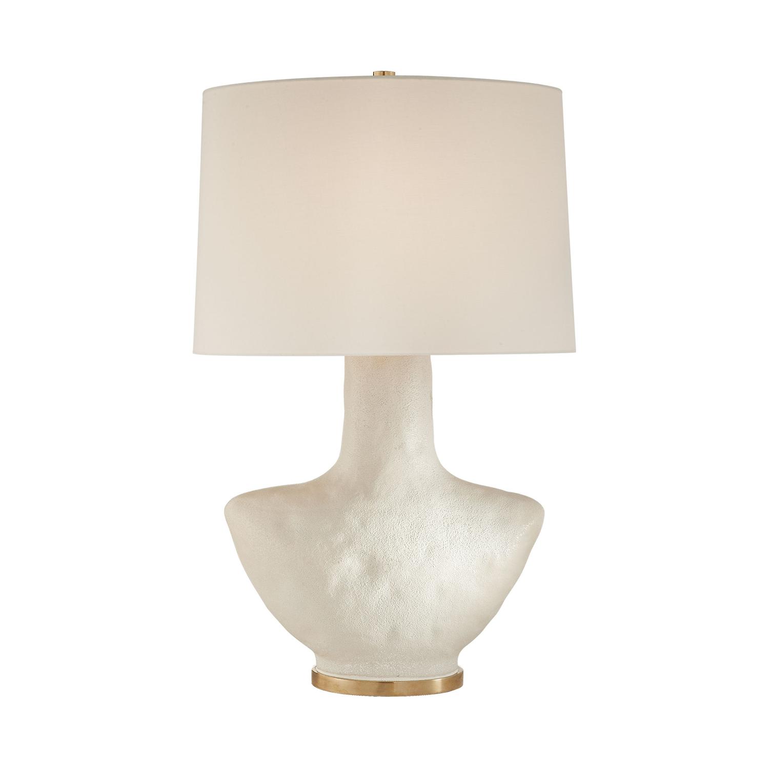 A wonderfully tactile white ceramic table lamp with white linen shade, designed by Kelly Wearstler. The base has been coated with a reactive ceramic glaze that when fired gives the material a unique pearlescent sheen. With its organic shapes and metallic accents, this table lamp exudes an air of opulence. Armato Table Lamp White, Table Lamp - Andrew Martin