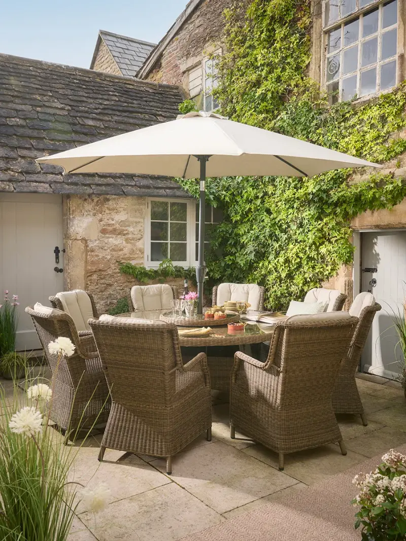 With 8 seats to host friends and family during the long summer days, our Ashcombe dining set offers ample space for all of your entertaining. Each chair has a high back, promoting ultimate comfort, whilst the plump cushions offer a soft place to land, allowing you to while away the hours blissfully. Crafted from a delicate rattan, the matching table creates a set that is reminiscent of Granny's garden, offering a touch of cottagecore energy to your garden. What's more, the central lazy Susan makes it the perfect place for holding nibbles and sharing a laugh with guests, and with the parasol included, allows you to hide away from the sun and enjoy your time in the garden for longer. Click here to view our useful Outdoor Furniture Buying Guide. Click here for our Outdoor Furniture Care Guide.