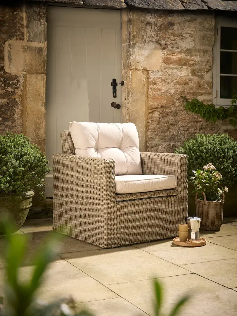 With a boxy frame crafted from faux wicker, our Ashwick Storage Armchair is the perfect blend of traditional style with a contemporary finish.The natural wicker works wonderfully with the neutral cushions, which are padded for ultimate comfort. The seat pad is finished with button detailing, creating a look that is reminiscent of Granny's cottage.What's better, the seat of this armchair lifts upwards, offering ample storage for cushions when not in use.Pair with our Ashwick Storage Sofa for a cohesive garden scheme.