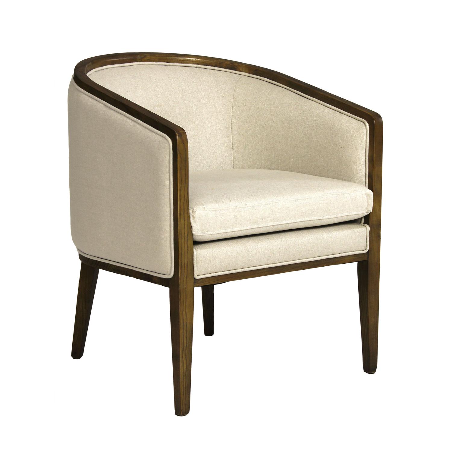 Mid-century modern chair in cream fabric with wood frame This versatile armchair is ready to slide seamlessly into any interior style. Inspired by mid-century design Audrey is formed from a dark stained wood frame which curves elegantly around the back of the chair. The wrap around back and sides, and seat cushion, are upholstered in a fresh natural coloured linen fabric with irregular textured slubs, contributing to its fresh, contemporary feel. Audrey Chair, Chair, Light Neutral - Andrew Martin Other Fabric