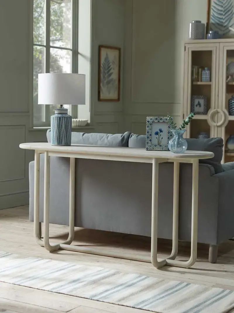 Marrying a simple combination of neutral tones and curved lines, our Bari Console Table features soft and gentle table legs that curve beneath the table into a cross shape, perfect for a home that is inspired by modern interiors. With an oblong shape table top, this console table will fit beautifully behind a sofa, as we have done here, or in your hallway to hold keys and accessories. Also available as a coffee table.