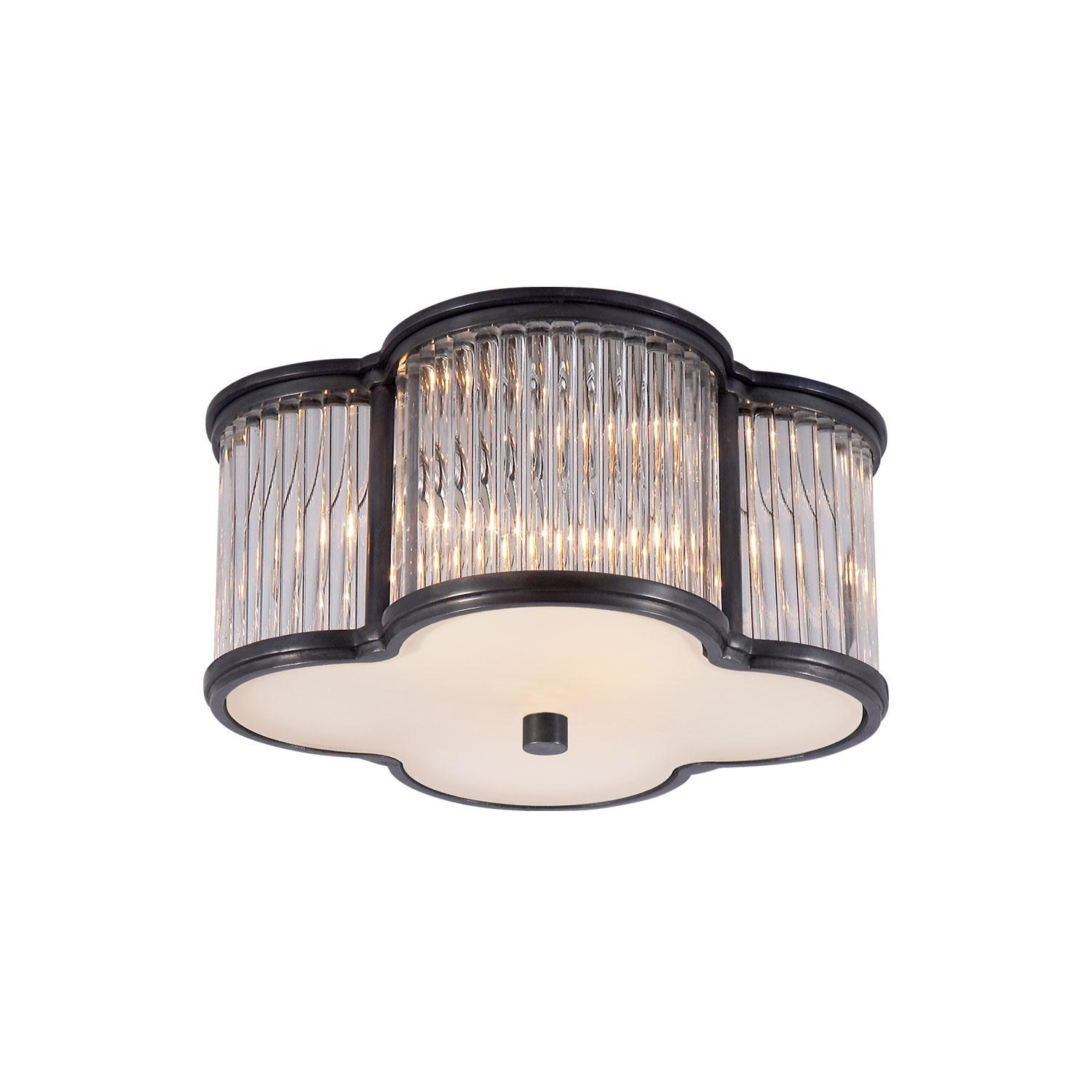 A glamorous Art Deco ceiling light shaped as a clover, crafted by high-style designer Alexa Hampton. In gunmetal with surrounding clear glass rods and a frosted glass base, Basil lights a room with a low shimmer, as if ricocheting off crystal. Available in two sizes. Basil Ceiling Light Large Gunmetal, Ceiling Light, Large, Gun Metal & Glass - Andrew Martin