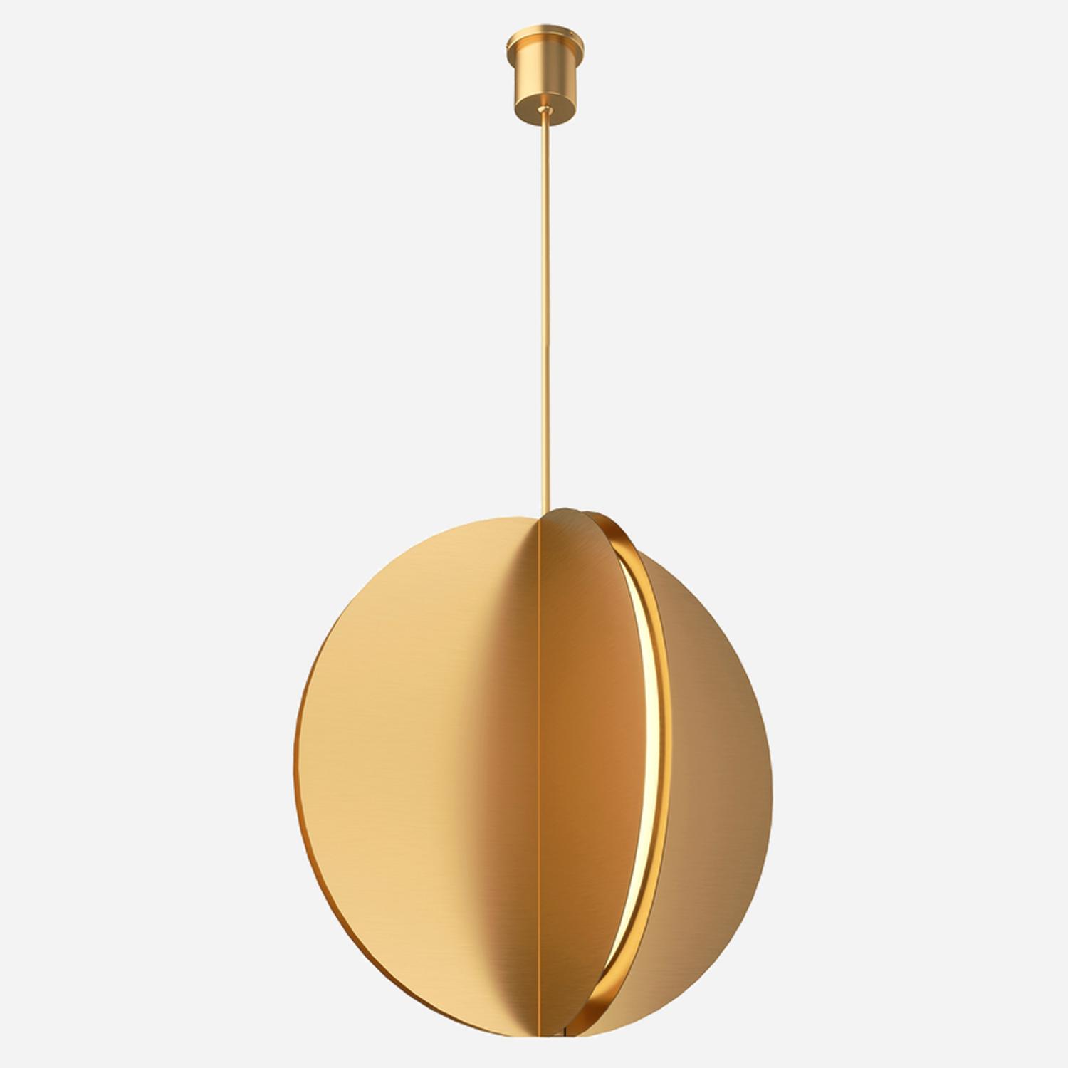 Embrace the Bauhaus movement with the Bau chandelier by Sean Lavin. Featuring a bold geometric shape, metal-stamped fins, and integrated LEDs for warm, indirect illumination. Perfect for modern interiors. Bau Pendant Natural Brass, Light, Medium - Andrew Martin