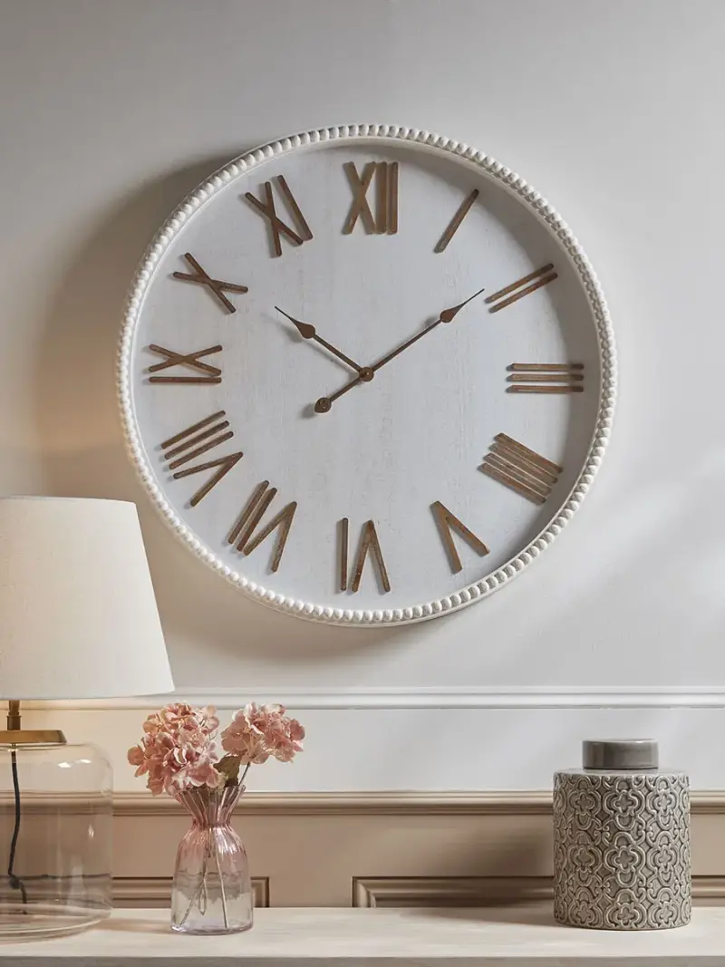 With a slightly distressed finish, this clock has a vintage appeal that brings an element of elegance to your space.With a beaded edge, the clock face has wooden roman numerals and similarly toned hands that stand out from the white painted face.As part of our Faded Elegance trend, this clock can be hung anywhere in your home - from your hallway to your bedroom.