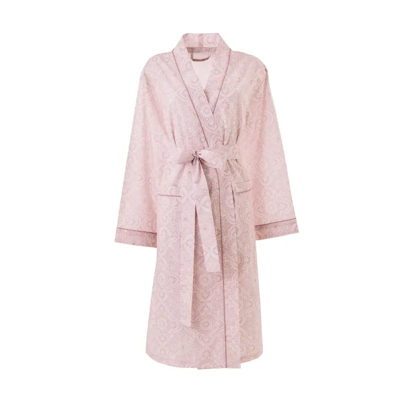 Della Robe Tuberose All over floral tile design patterned pjs in a soft tuberose colourway with a shirt style button front top with fine pipping around cuffs, colour and shirt front. The turned-up trousers are complete with pocket detailing. The coordinating kimono style robe is finished with a waist belt all in 100% cotton percale, 180 thread count.