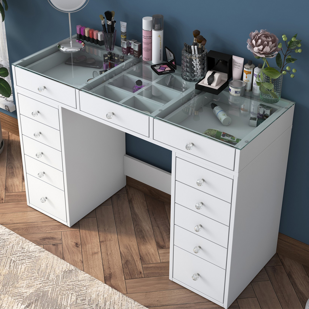 Belara Glass Top Dressing Table With 13 Drawers In White