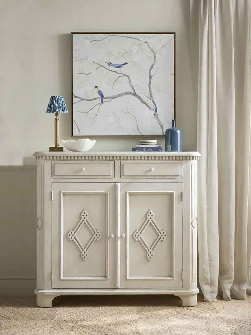 Full of character, this painted sideboard introduces a lighter aesthetic to your home this season.Crafted from pine with a soft whitewashed finish, this two-drawer unit features cupboards beneath. Its design includes a carved diamond motif on each cupboard door and a crenellated border at the top.Providing ample storage space for a wealth of oddments, it will be equally welcome in the living or dining room.