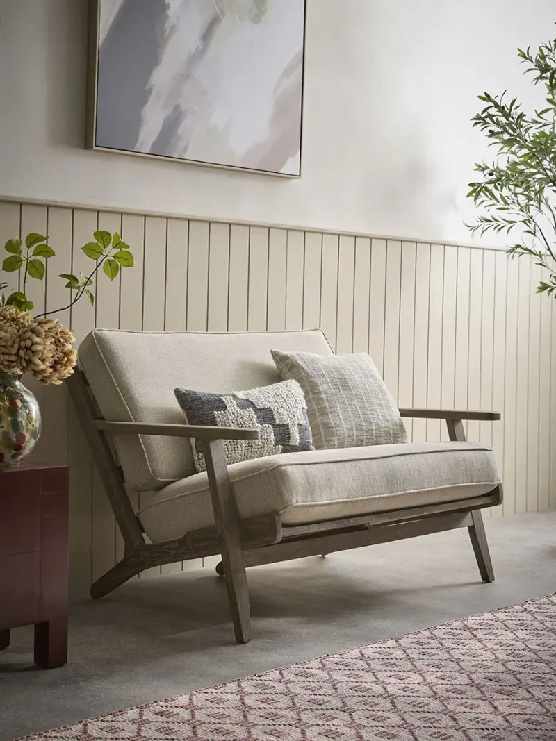 Perfectly balancing comfort and craftsmanship, the Billund Sofa is a considered piece for relaxed modern living.Set on a subtly angled wooden frame, its open silhouette feels light and contemporary, while the softly upholstered cushions offer generous comfort and an inviting, laid-back feel.Perfect for smaller living rooms, garden rooms or quiet corners, the Billund Sofa offers an elegant place to unwind.