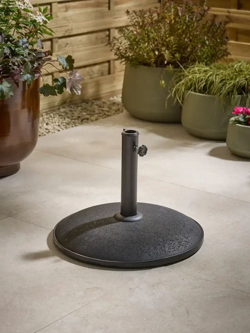 Bring stability to garden days with this stylish and sturdy parasol base.Weighing in at a reassuring 25kg, the base is made from concrete and steel, with a smart contemporary black finish.