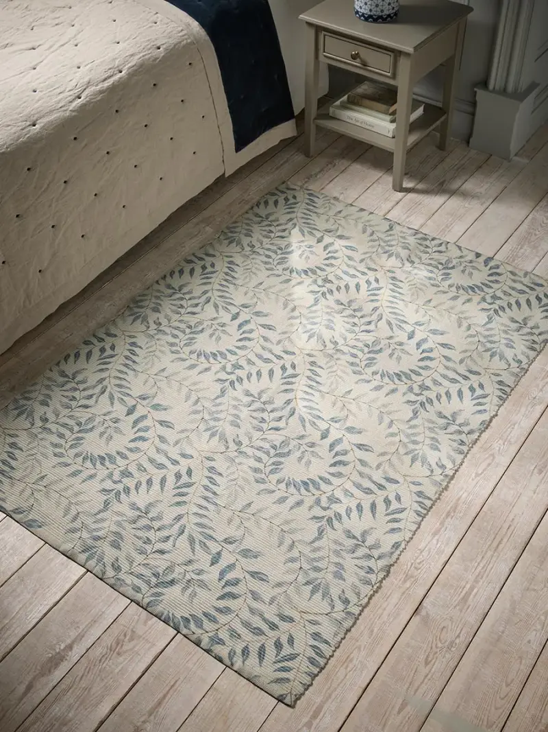 Softly patterned with trailing blue vines, this indoor/outdoor rug brings a calm, botanical elegance to any space.Designed to transition effortlessly between inside and out, it offers a refined yet relaxed foundation for living areas, garden rooms or terraces. Hard-wearing and washable, the low-profile weave combines everyday practicality with a quietly considered aesthetic, perfect for creating a light, layered look.