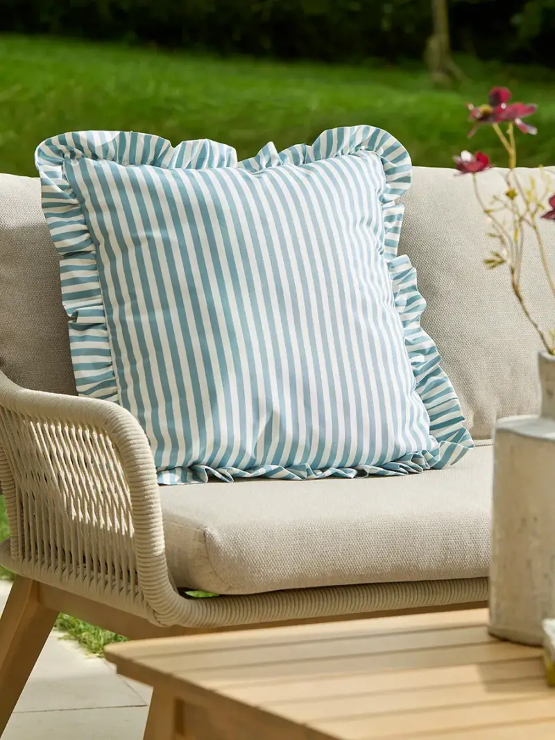 Introduce soft, timeless charm to your outdoor seating with our ruffle edged cushion in slender blue and white stripes. Perfect for elevating loungers, benches, or garden chairs, this cushion is made from durable, water-resistant materials. A discreet zip closure allows for easy removal and spot cleaning, so your cushions stay looking effortlessly smart all season.
