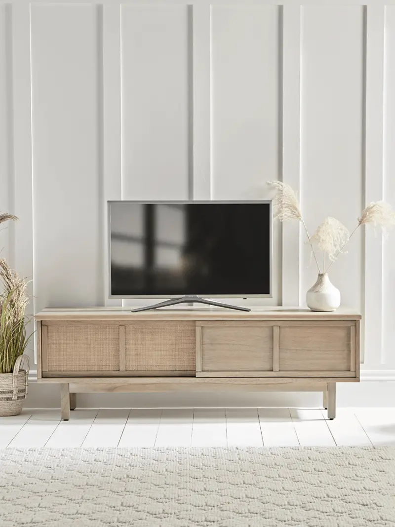 Achieve a clean, minimalist aesthetic in your living space with our Boren Media Unit. Crafted using beautiful Mindi wood with a slightly weathered finish and hand woven rattan cane webbing for a serene, natural touch, this unit has plenty of space on its smooth surface for your media screen as well as a few ornaments.Behind two sliding doors can be found ample space for stowing everything from entertainment consoles and DVDs to books and board games, with one adjustable shelf allowing for flexible storage.A coordinating cabinet and sideboard are also available.