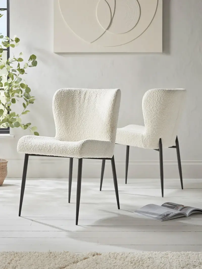 With soft curved edges, our Bouclé Dining Chair brings comfort and style to your dining space. In a luxuriously soft bouclé material, the light neutral colour contrasts with the striking black legs, creating a contemporary look. As part of our New Neutral trend, this chair would pair perfectly in a contemporary and minimalist interior scheme.