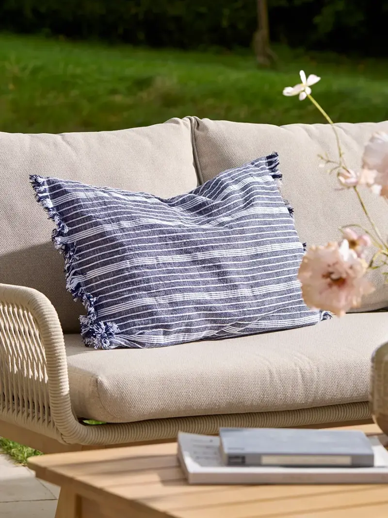 Rich in texture and understated detail, our Bramble Row Striped Outdoor Cushion brings effortless Scandi charm to your outdoor seating.Woven white stripes sit across a deep denim-blue backdrop, with a mix of fine and bold lines that create a beautifully balanced, minimalist pattern. Finished with soft, fringed edges, it adds a relaxed, tactile feel to any bench, chair, or outdoor sofa. Made from 100% cotton with a water-resistant finish, this cushion offers both softness and durability, making it perfect for long summer days outdoors. The double-sided design ensures lasting style from every angle, while the discreet zip closure keeps the look clean and allows for easy removal and care.