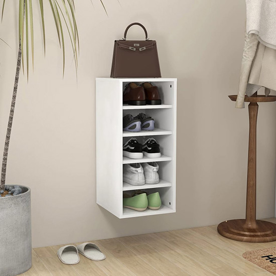 Branko Wooden Shoe Storage Rack With 5 Shelves In White, This timeless shoe cabinet presents an excellent shoe storage solution for your bedroom or hallway. You will no longer be annoyed by shoes cluttering your floor. FEATURES : Material : Engineered Wood Finish : White This shoe organiser is durable and sturdy The shoe rack has 5 compartments, providing ample space for keeping your shoes well organised Additionally, you can fix it on the ground or the wall based on your own needs Can be assembled on the ground or on the wall In order to prevent overturning, this product must be used with the wall attachment device provided Available at an affordable price Images shown are for illustration purpose only DIMENSIONS : Height : 70cm Length : 31. 5cm Width : 35cm