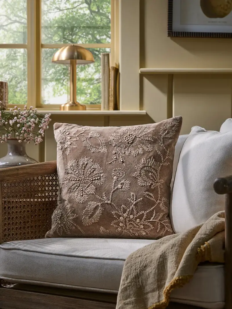 Blending beautifully into the dusky terracotta background, this cushion features a delicately embroidered floral pattern in lighter tones that trails up the cover, creating the most intricate finish in your home.