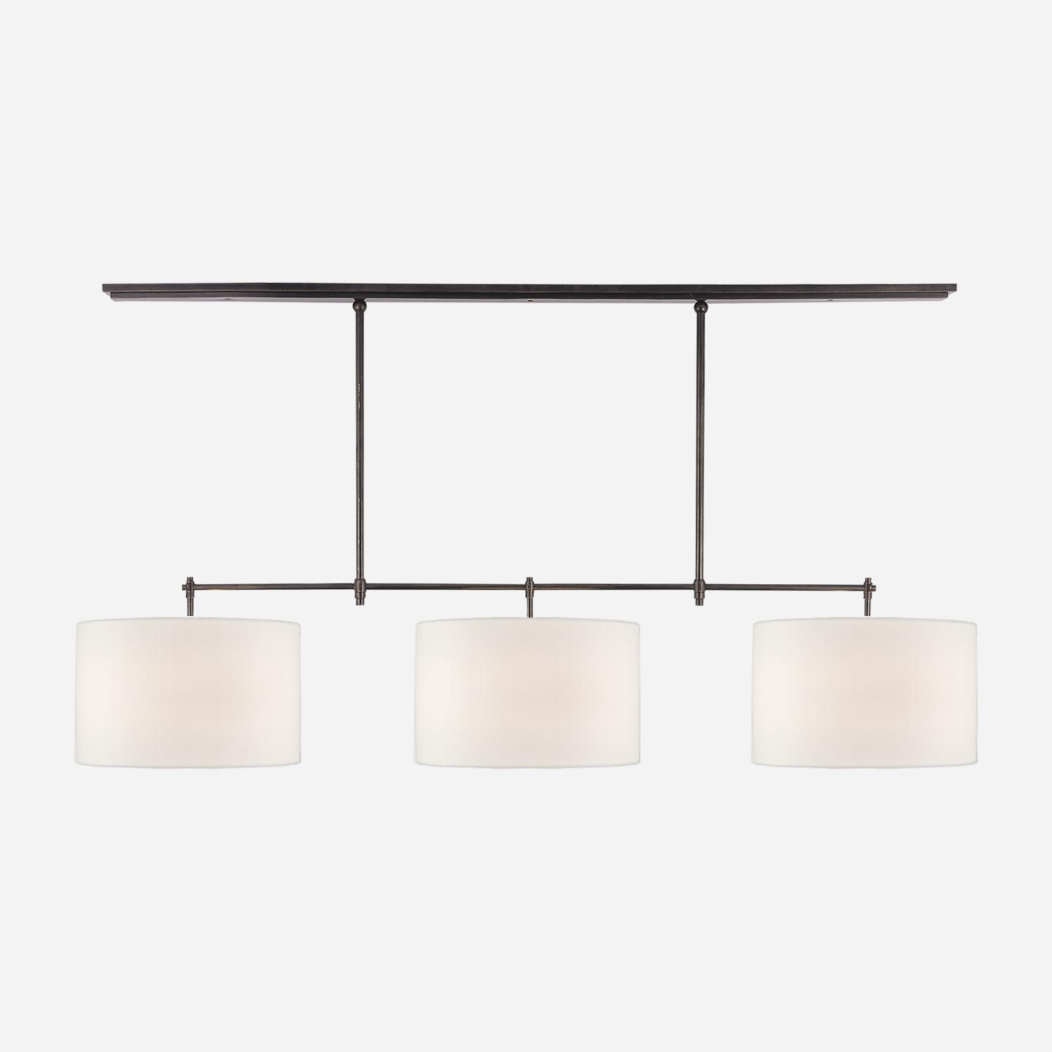A billiard light in bronze with three natural paper shades and an interesting linear silhouette. Crafted by iconic designer Thomas O’Brien, place Bryant over a dining table to add some modern industrial chic into you home. Available in two sizes. Bryant Pendant Bronze, Ceiling Light, Large - Andrew Martin