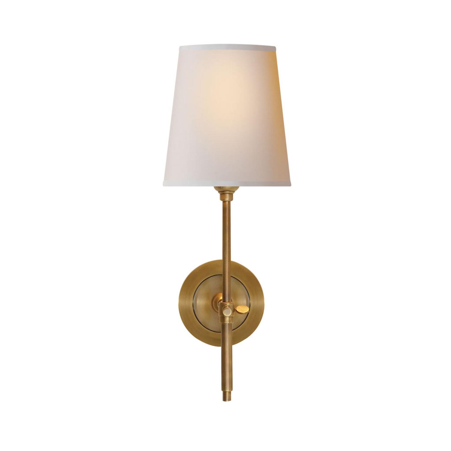 Small wall lamp in hand-rubbed antique brass with a plain natural shade. Crafted by iconic designer Thomas O’Brien, perfect for a bathroom or hallway. Bryant Wall Light Brass, Wall Light, Hand-Rubbed Antique Brass - Andrew Martin