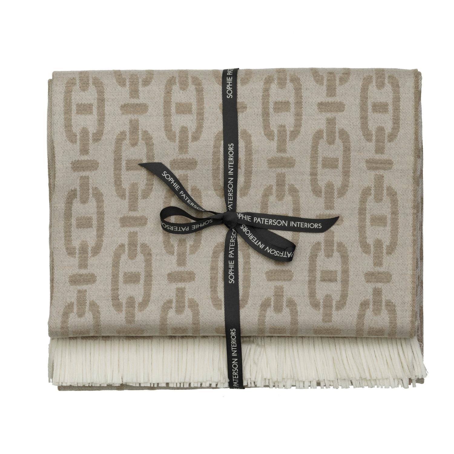 Burlington pattern luxurious throw with fringed edges in latte Perfect for adding a chic layer to any bed, sofa or chair this soft and luxurious throw has fringed edges and was woven in Italy from 90% Merino wool and 10% cashmere. In a pale nude shade this throw features our popular Burlington pattern, designed in collaboration with Sophie Paterson and inspired by the grand architecture of Mayfair's Burlington arcade. Burlington Throw Latte, Throw - Andrew Martin Sophie Paterson
