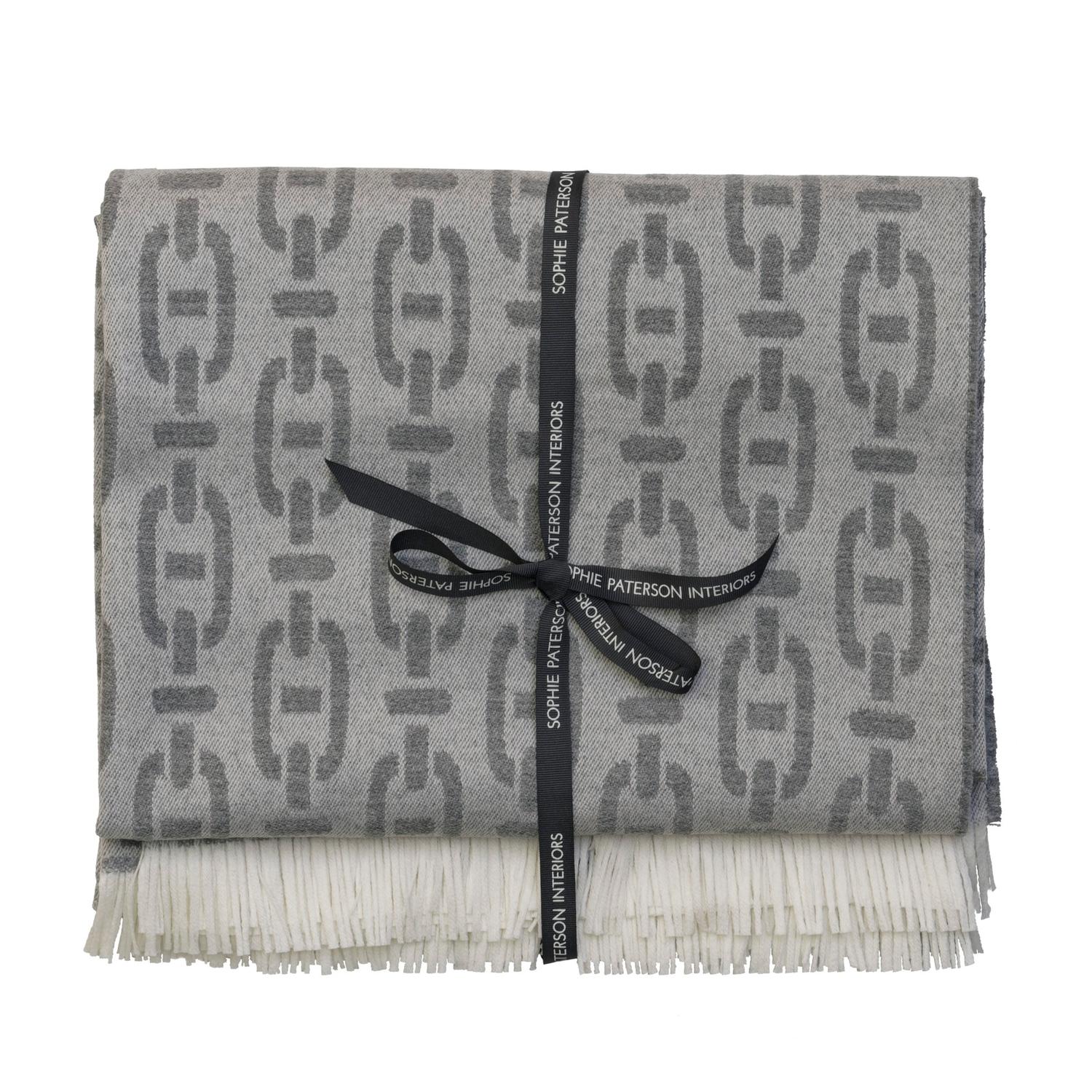 Burlington pattern luxurious throw with fringed edges in marl Perfect for adding a chic layer to any bed, sofa or chair this soft and luxurious throw has fringed edges and was woven in Italy from 90% Merino wool and 10% cashmere. In a sophisticated grey shade this throw features our popular Burlington pattern, designed in collaboration with Sophie Paterson and inspired by the grand architecture of Mayfair's Burlington arcade. Burlington Throw Marl, Throw - Andrew Martin Sophie Paterson