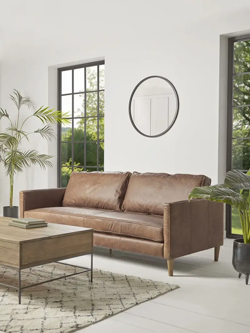 Create a warm, distinguished feel in your living space with our Calcott Leather Sofa. Wonderfully soft, the high quality leather has an authentically aged look for added character and with circular ash legs to complement, this sofa will elevate any setting. We have paired ours with an industrial style coffee table - the simplicity showcases its timeless style. Add plenty of indoor greenery to soften the edges.