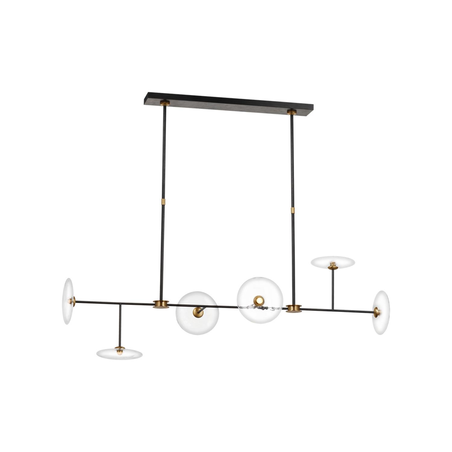 Elevate your space with the Calvino Linear Chandelier. Designed by Ian K. Fowler, this modern fixture features hand-blown glass discs and LED illumination for a sculptural, glowing effect. Calvino Linear Chandelier, Light, Brass/Iron - Andrew Martin