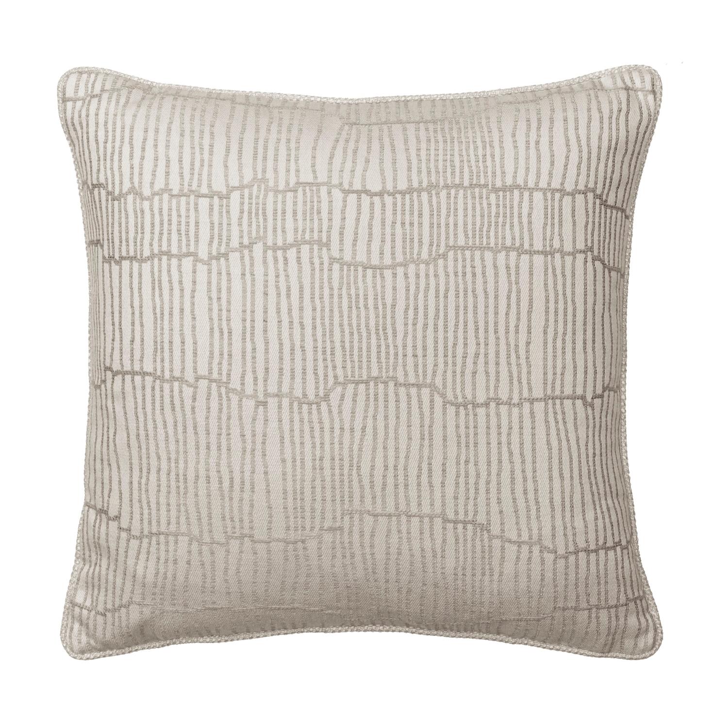 A cushion made from Canale String, a new design inspired by the intricate canal network of Venice in the region of Veneto in the northeast of Italy. This glamourous yarn weaves its way through a neutral matt ground woven from linen and viscose, just like the complex canals themselves. Canale String, Sustainable Feather, Cushion - Andrew Martin Sophie Paterson Geometric