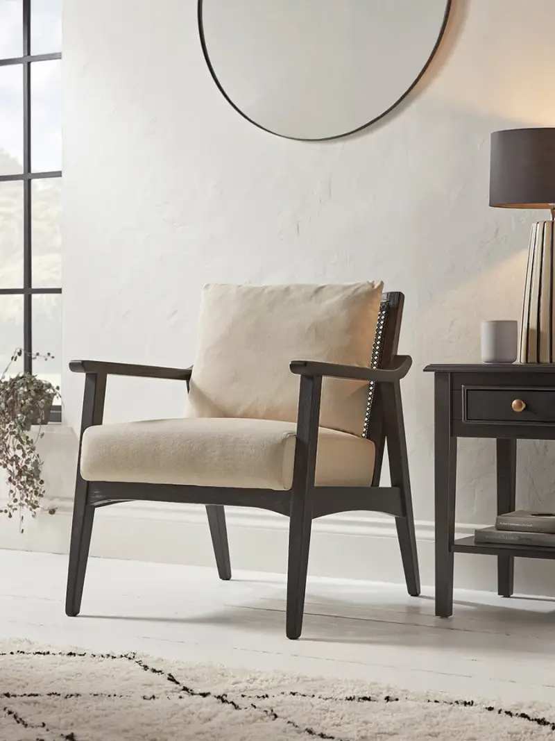 An uncomplicated structured frame wonderfully combines with a cane webbing back on this armchair to create a piece that is as stylish as it is comfortable. The black frame strikes a beautiful contrast against the neutral teddy bear like cushions, creating a modern piece for your home. Also available in natural.