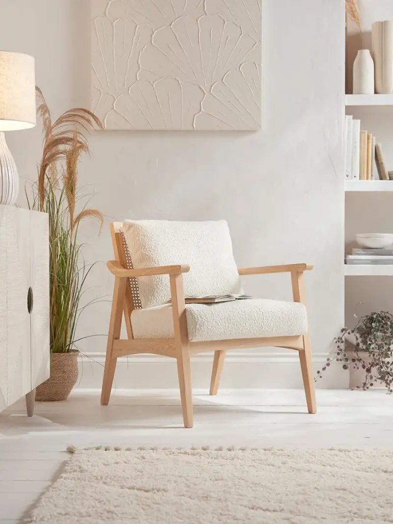An uncomplicated wooden frame wonderfully combines with a cane webbing back on this armchair to create a piece that is as stylish as it is comfortable. Pairing the timeless structure with intricate detailing, the neutral teddy bear style material adds an extra level of luxury for you to relax into. Also available in black.