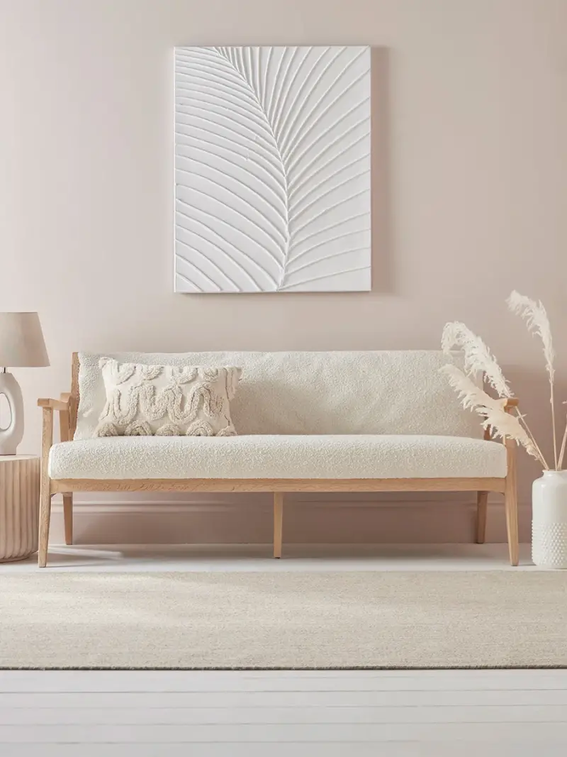 A delightful small sofa that allows the natural beauty and warmth of wood and rattan to take centre stage.The angular lines of the wooden frame are softened by the rattan fill to the back and the soft cushioning appeal of the boucle seat and back cushions.Its two seater sofa size makes it a lovely piece for smaller sitting rooms or open plan spaces which will allow the charming woven detailing to be on show.
