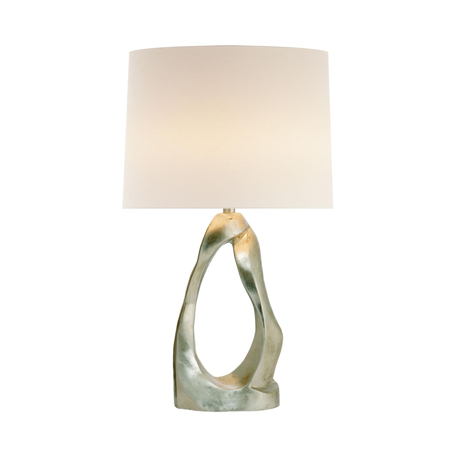 This large sculptural table lamp works perfectly placed on a side table or console, or as a part of a pair elegantly framing a bed or sofa. Designed by Aerin the artistic shape and metallic finish is the perfect blend of opulence and sophistication. Cannes Table Lamp Silver, Table Lamp, Burnished Silver Leaf - Andrew Martin